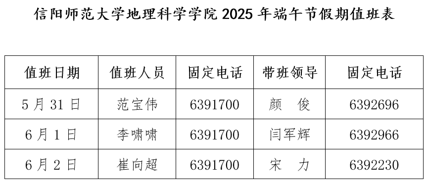 信陽(yáng)師范大學(xué)地理科學(xué)學(xué)院2025年端午節(jié)假期值班表
