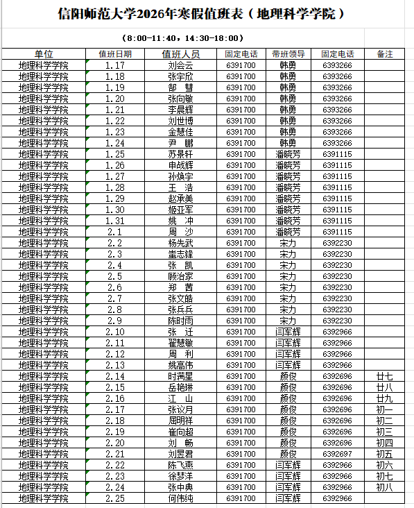 地理科學學院2026年寒假值班表