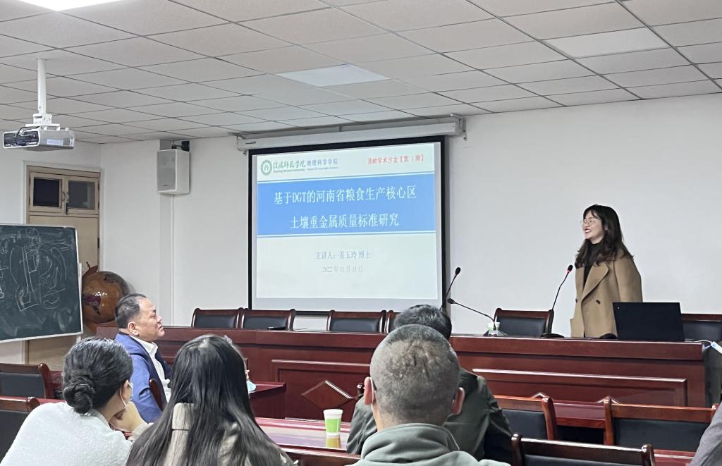 報(bào)告會(huì)上,姜玉玲博士以河南省糧食生產(chǎn)核心區(qū)農(nóng)田土壤和小麥為研究對(duì)象,利用DGT技術(shù)和傳統(tǒng)化學(xué)提取法提取了土壤重金屬的有效態(tài)含量,結(jié)合國(guó)家食品重金屬限量標(biāo)準(zhǔn)和作物膳食暴露重金屬健康風(fēng)險(xiǎn)模型,建立了基于DGT的河南省糧產(chǎn)區(qū)土壤重金屬質(zhì)量標(biāo)準(zhǔn),并對(duì)該質(zhì)量標(biāo)準(zhǔn)進(jìn)行了驗(yàn)證,指出了建立標(biāo)準(zhǔn)的適用條件和適用范圍。姜老師指出,該研究不僅對(duì)提升農(nóng)產(chǎn)品產(chǎn)地環(huán)境、保障農(nóng)產(chǎn)品質(zhì)量安全具有現(xiàn)實(shí)意義,還可為我國(guó)其它省市建立地方性的土壤重金屬質(zhì)量標(biāo)準(zhǔn)提供借鑒。自由討論環(huán)節(jié),姜博士詳細(xì)解答了師生的問(wèn)題,并就報(bào)告內(nèi)容進(jìn)行了熱烈討論,現(xiàn)場(chǎng)氣氛活躍。牛院長(zhǎng)對(duì)姜老師的精彩報(bào)告表示感謝,充分肯定了此次報(bào)告的學(xué)術(shù)性和專業(yè)性,并就如何基于報(bào)告內(nèi)容申報(bào)國(guó)家自然科學(xué)基金進(jìn)行了探討。牛院長(zhǎng)總結(jié)指出,賢嶺學(xué)術(shù)沙龍是學(xué)院系列學(xué)術(shù)活動(dòng)之一,旨在營(yíng)造良好學(xué)術(shù)氛圍,搭建學(xué)術(shù)交流平臺(tái),希望通過(guò)學(xué)術(shù)沙龍活動(dòng)交流學(xué)術(shù)思想、分享學(xué)術(shù)成果、提高師生學(xué)術(shù)素養(yǎng)。