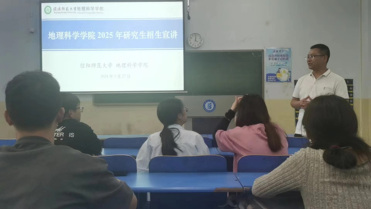 會議伊始,林昊博士首先對信陽師范大學(xué)地理位置、建校歷史、辦學(xué)條件、教育教學(xué)、學(xué)科科研等基本情況進(jìn)行簡要介紹。隨后,他圍繞地理科學(xué)學(xué)院專業(yè)設(shè)置、實(shí)驗(yàn)室與重點(diǎn)學(xué)科建設(shè)、教研平臺、科研項(xiàng)目及科研獲獎等方面介紹了地理科學(xué)學(xué)院近些年取得的主要成就。在此基礎(chǔ)上,林昊博士詳細(xì)解讀了2025年地理科學(xué)學(xué)院研究生招生政策,對我院的招生規(guī)模和類型、考試科目、參考書目、資助政策與就業(yè)等方面進(jìn)行詳細(xì)介紹。會后,林昊博士耐心細(xì)致地解答了學(xué)生關(guān)心的導(dǎo)師選擇、培養(yǎng)方案、宿舍安排等問題,并鼓勵同學(xué)們積極報考我院碩士研究生。現(xiàn)場互動頻繁,氣氛熱烈。