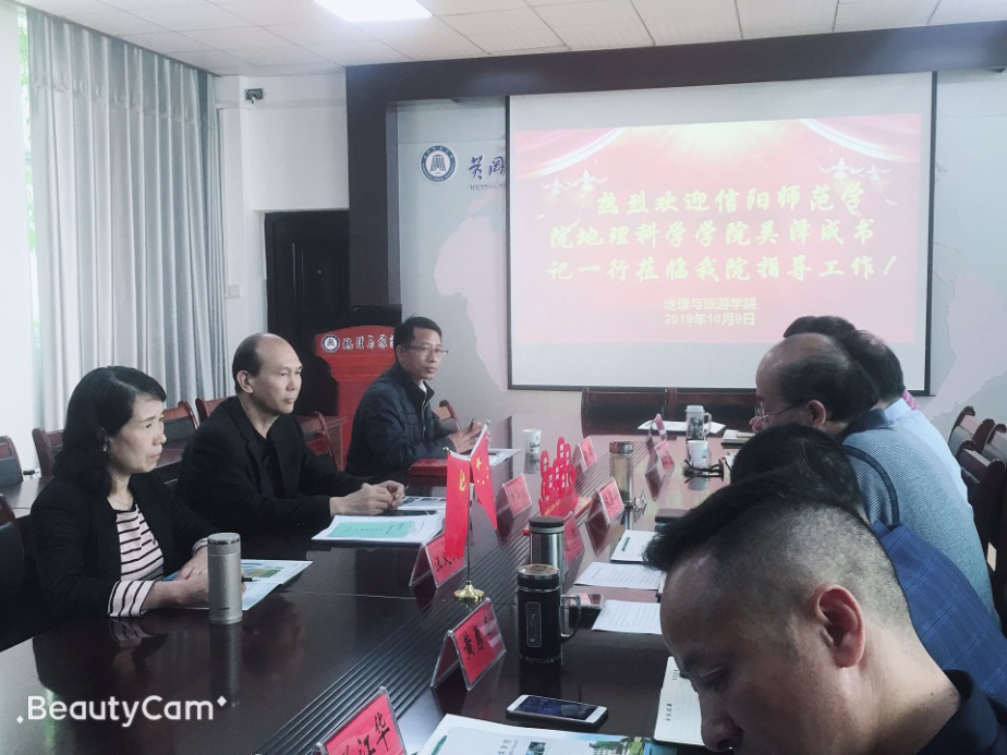 2019年10月9-10日,地理科學(xué)學(xué)院黨委書記吳澤成、副院長王義民、地理科學(xué)專業(yè)負(fù)責(zé)人顏俊博士前往黃岡師范學(xué)院地理與旅游學(xué)院進行“不忘初心,牢記使命”主題教育交流和碩士研究生招生宣傳。黃岡師范學(xué)院研究生處副處長胡世剛、地理與旅游學(xué)院黨委書記李月華、院長楊凱等班子成員以及部分教授、博士參加交流。
