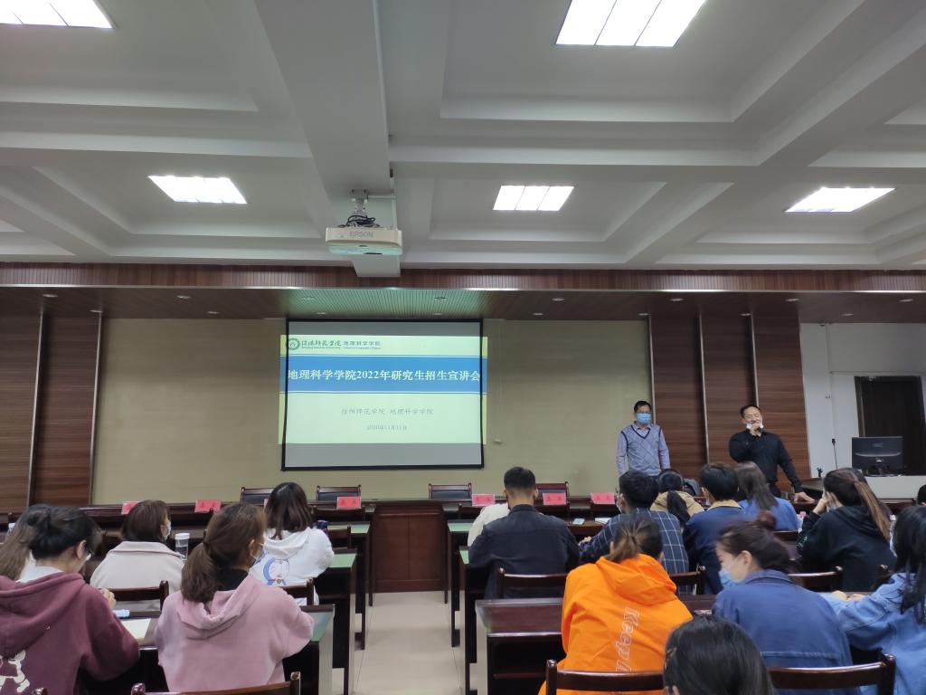 宣講會上,閆軍輝副教授首先介紹了信陽師范學(xué)院的基本情況,接著從地理科學(xué)學(xué)院發(fā)展歷史、專業(yè)設(shè)置、師資隊伍、實驗室與重點學(xué)科建設(shè)、教學(xué)與科研平臺及科研成果等方面,介紹了地理科學(xué)學(xué)院近些年取得的主要成績。并在此基礎(chǔ)上對2021年地理科學(xué)學(xué)院研究生招生政策進(jìn)行詳細(xì)解讀,就學(xué)生感興趣的招生規(guī)模與類型、考試科目與教材、資助政策與就業(yè)等問題和參會同學(xué)進(jìn)行耐心交流。閆軍輝指出,信陽師范學(xué)院環(huán)境優(yōu)美,學(xué)習(xí)氛圍濃厚,非常適合廣大學(xué)子就讀深造。地理科學(xué)學(xué)院近年來發(fā)展迅速,學(xué)院擁有一批年齡、學(xué)歷、職稱、專業(yè)結(jié)構(gòu)合理的導(dǎo)師隊伍,儀器設(shè)備齊全、科研氛圍濃厚,畢業(yè)生就業(yè)情況良好,歡迎與會學(xué)生報考。關(guān)院長對我院的到來表示歡迎,他指出,信陽師范學(xué)院地理科學(xué)學(xué)院已和黃岡師范學(xué)院地理與旅游學(xué)院簽署了聯(lián)合培養(yǎng)研究生的協(xié)議,雙方近年來在黨建、研究生培養(yǎng)等方面展開了多方面的交流,合作基礎(chǔ)良好。地理科學(xué)學(xué)院擁有一大批獲得國家級項目的導(dǎo)師,科研水平很高,希望各位同學(xué)積極報考。