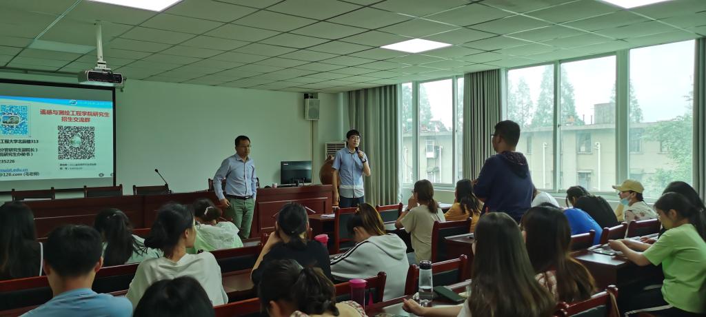 宣講會(huì)上,何鵬飛博士從南京信息工程大學(xué)的校訓(xùn)入手,首先介紹了南京信息工程大學(xué)的基本情況。接著,何老師從發(fā)展歷程、師資隊(duì)伍、人才培養(yǎng)、招生計(jì)劃、獲得獎(jiǎng)項(xiàng)等方面,對(duì)遙感與測(cè)繪工程學(xué)院進(jìn)行了詳細(xì)的介紹。討論環(huán)節(jié),何鵬飛博士就學(xué)生關(guān)心的招生類型與規(guī)模、初試和復(fù)試科目、畢業(yè)生就業(yè)情況等問題,與參會(huì)的學(xué)生進(jìn)行了交流,耐心地回答了同學(xué)提出的問題,現(xiàn)場(chǎng)氣氛活躍。閆軍輝副教授對(duì)何博士的到來表示感謝。閆老師指出,南京信息工程大學(xué)是一所在全國(guó)排名前百的名校,師資力量雄厚,科研成果豐碩,學(xué)生就業(yè)率高,尤其是其師資的國(guó)際化率高,是學(xué)生深造的理想院校。遙感與測(cè)繪工程學(xué)院獲批國(guó)家級(jí)一流本科專業(yè)“測(cè)繪工程”和省級(jí)一流本科專業(yè)“遙感科學(xué)與技術(shù)”和地理空間信息工程專業(yè);擁有測(cè)繪科學(xué)與技術(shù)、資源與環(huán)境(測(cè)繪工程方向)2個(gè)碩士點(diǎn)和3S集成與氣象應(yīng)用、環(huán)境遙感、導(dǎo)航與空間信息3個(gè)博士點(diǎn),與我們學(xué)院的專業(yè)契合度很高,鼓勵(lì)同學(xué)們報(bào)考南京信息工程大學(xué)。
