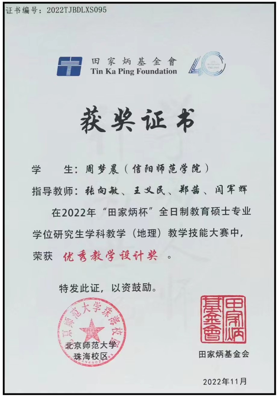 本次大賽由“田家炳杯”全日制教育碩士專業(yè)學(xué)位研究生教學(xué)技能大賽專家委員會、學(xué)科教學(xué)(地理)專家組組織,由北京師范大學(xué)主辦、北京師范大學(xué)珠海校區(qū)承辦,是高等教育質(zhì)量監(jiān)測國家數(shù)據(jù)平臺認(rèn)定的唯一一項(xiàng)國家級教育碩士教學(xué)技能競賽。比賽4月初啟動,分為初賽和決賽兩個環(huán)節(jié),初賽環(huán)節(jié)吸引了全國57所高校共207名選手參加。經(jīng)過初賽評審,共有104位同學(xué)進(jìn)入決賽。決賽采取騰訊會議平臺進(jìn)行,選手進(jìn)行15分鐘現(xiàn)場直播授課和5分鐘專家提問。決賽中,周夢晨同學(xué)沉著鎮(zhèn)定,憑借良好的素質(zhì)和教育教學(xué)技能,出色完成現(xiàn)場授課和專家提問回答環(huán)節(jié),喜獲“優(yōu)秀教學(xué)設(shè)計(jì)獎”。