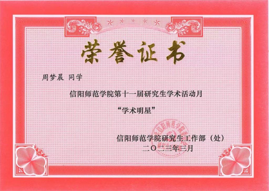 為繼承和發(fā)揚(yáng)優(yōu)良學(xué)術(shù)傳統(tǒng),展示良好的學(xué)術(shù)風(fēng)貌,學(xué)校啟動了研究生活動月,開展了一系列活動,其中“學(xué)術(shù)明星”評選是學(xué)術(shù)活動月的重要內(nèi)容之一。參賽選手圍繞學(xué)術(shù)成果、社會實(shí)踐、獲獎情況等方面進(jìn)行成果展示,每年評選10名,競爭十分激烈。經(jīng)過精彩的展示,我院研究生周夢晨從近40名候選人中脫穎而出,榮獲“學(xué)術(shù)明星”稱號。入學(xué)以來,周夢晨同學(xué)深耕學(xué)術(shù),潛心科研,積極參加各種學(xué)科競賽,研究生期間以第一作者身份在《中學(xué)地理教學(xué)參考》發(fā)表文章一篇,以第二作者身份在《地理教育》發(fā)表文章一篇,在首屆“田家炳杯”全國教育碩士教學(xué)技能大賽獲“優(yōu)秀教學(xué)設(shè)計(jì)”獎,主持2021年信陽師范學(xué)院研究生科研創(chuàng)新基金項(xiàng)目1項(xiàng)。學(xué)習(xí)之余,周夢晨同學(xué)曾擔(dān)任學(xué)院研究生會職業(yè)規(guī)劃部副部長,并榮獲信陽師范學(xué)院“優(yōu)秀研究生干部”稱號。