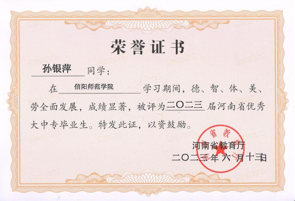 近日,河南省教育廳下發(fā)《關于表彰2023年河南省優(yōu)秀應屆大中專畢業(yè)生的通知》(教學〔2023〕205號),我院2020級地圖學與地理信息系統(tǒng)專業(yè)碩士畢業(yè)生孫銀萍同學榮獲“河南省優(yōu)秀應屆大中專畢業(yè)生”榮譽稱號。