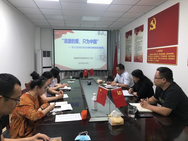為進(jìn)一步落實(shí)立德樹(shù)人根本任務(wù),組織開(kāi)展暑期“云”教育系列活動(dòng),6月24日上午10點(diǎn),地理科學(xué)學(xué)院黨委書(shū)記宋力線上為20級(jí)學(xué)生講專題黨課“清澈的愛(ài),只為中國(guó)”——學(xué)習(xí)習(xí)近平總書(shū)記對(duì)青年的青春寄語(yǔ)精神。會(huì)議采取線上線下相結(jié)合的方式進(jìn)行,黨委書(shū)記宋力、院長(zhǎng)牛繼強(qiáng)、黨委副書(shū)記朱明、學(xué)院輔導(dǎo)員線下參會(huì),會(huì)議由副書(shū)記朱明主持。