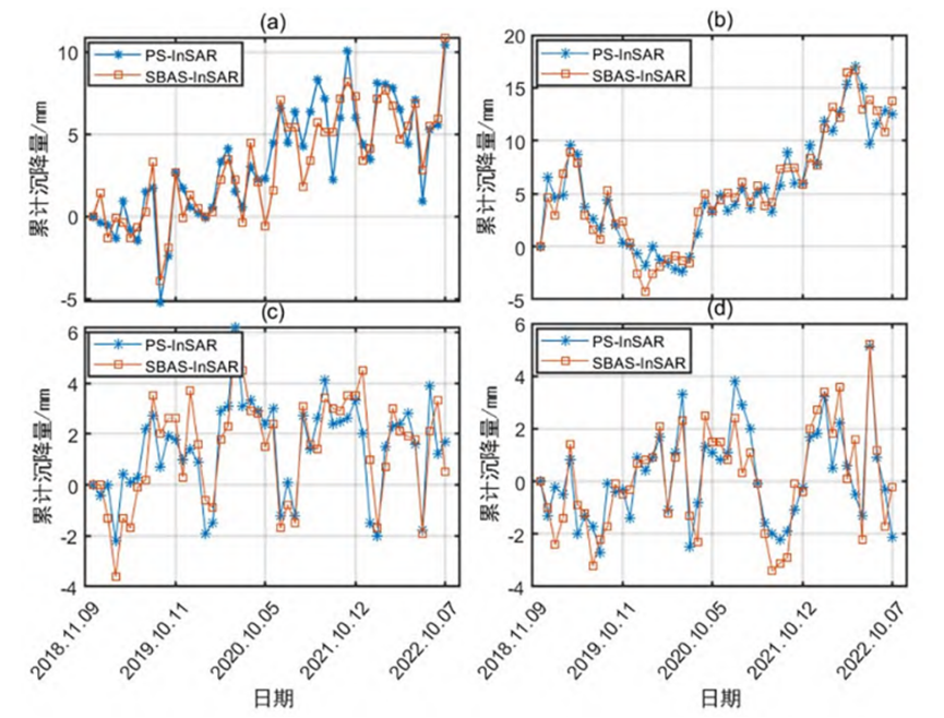 圖2 PS-InSAR與SBAS-InSAR特征點累積沉降
