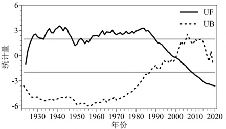 圖2 1923-2020年北京市年日照時數(shù)Mann-Kendall突變分析