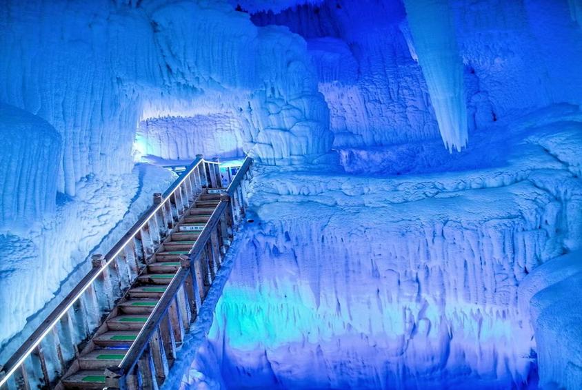萬年冰洞實(shí)際上是一處石灰?guī)r溶洞,洞內(nèi)有冰柱、冰石筍、冰鐘乳石、冰渦管、冰花、冰葡萄、冰的結(jié)晶片等。堪稱一個冰的世界,在五彩燈光的照射下,呈現(xiàn)出夢幻般的景象。冰洞入口是一條4米多長的冰隧道,冰洞的第二層,右側(cè)是一根直通洞頂高達(dá)10余米的冰柱,被稱為“定洞神針”。其中一面美輪美奐、晶瑩剔透的大冰簾,叫“玉簾垂空”,玉簾的正面則是一條大冰瀑。