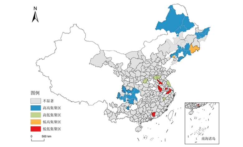 進(jìn)一步運(yùn)用空間自相關(guān)分析方法探測(cè)流動(dòng)人口離婚率的空間集聚特征,借助Local Moran'I指(局部莫蘭指數(shù),用于識(shí)別空間冷熱點(diǎn))計(jì)算得到流動(dòng)人口離婚率的LISA(局部空間關(guān)聯(lián)指示圖)集聚圖,流動(dòng)人口離婚率呈現(xiàn)出明顯的空間集聚特征。