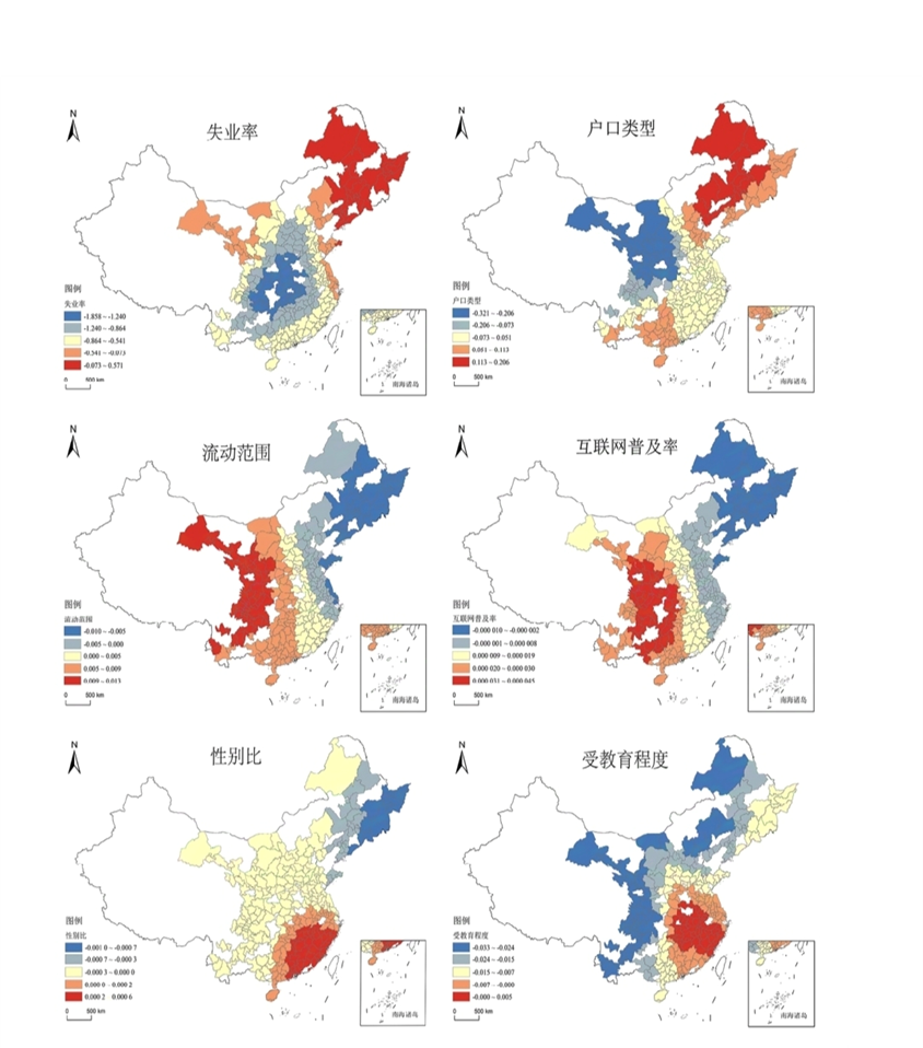 研究者還探討了流動(dòng)人口離婚率影響因素的空間異質(zhì)性特征,結(jié)果表明,失業(yè)率對(duì)流動(dòng)人口離婚率的負(fù)向影響呈現(xiàn)出從中部地區(qū)向周邊遞減的特征,戶口類型對(duì)流動(dòng)人口離婚率的正向影響集中在東北地區(qū),負(fù)向影響集中在西部地區(qū),互聯(lián)網(wǎng)普及程度對(duì)流動(dòng)人口離婚率的正向影響集中在西部地區(qū),性別比對(duì)流動(dòng)人口離婚率的負(fù)向影響呈現(xiàn)出從東北地區(qū)向周邊地區(qū)遞減的特征,受教育程度對(duì)流動(dòng)人口離婚率的負(fù)向影響集中在西部地區(qū)。