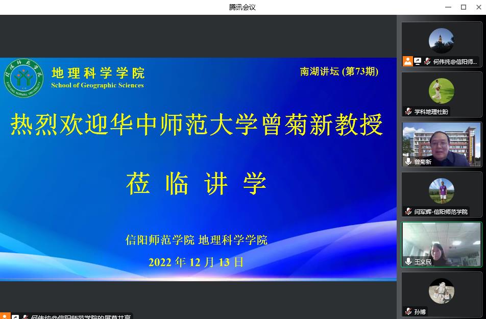 12月13日下午,應地理科學學院邀請,華中師范大學曾菊新教授以騰訊會議平臺的形式為我院師生作了題為“敬畏自然:學苑論衡、政府導向及生態(tài)價值觀研究”的學術報告。學院青年教師、碩士研究生和部分本科生150余人參加報告會,報告會由副院長王義民教授主持。